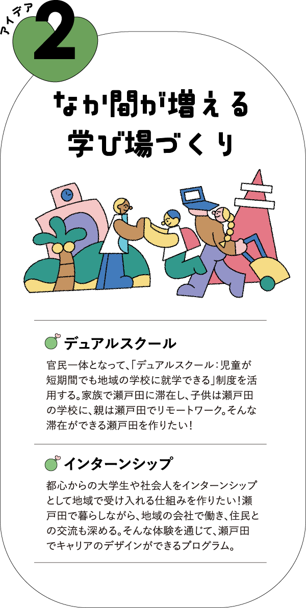たくさんの方々に参加していただいた「しおまちとワークショップ」から約4年。話し合いの中から生まれた事業のアイデアは少しずつ形となり、瀬戸田は賑わいと活気を取り戻しつつあります。その一方で、子どもたちが少しずつ減ってきているという現実もあります。