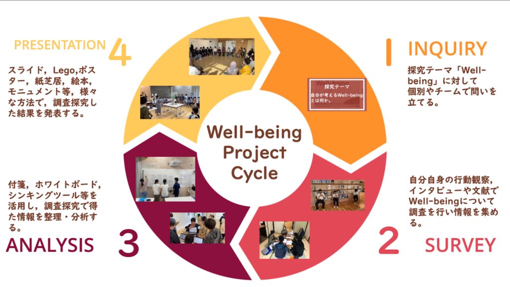 HiGAを象徴する取り組みのひとつが、「未来創造科」と呼ばれる総合的な学習の時間だ。ここでは「Well-being(幸せ)」をテーマに、生徒たちが半年以上かけて探究を行う。